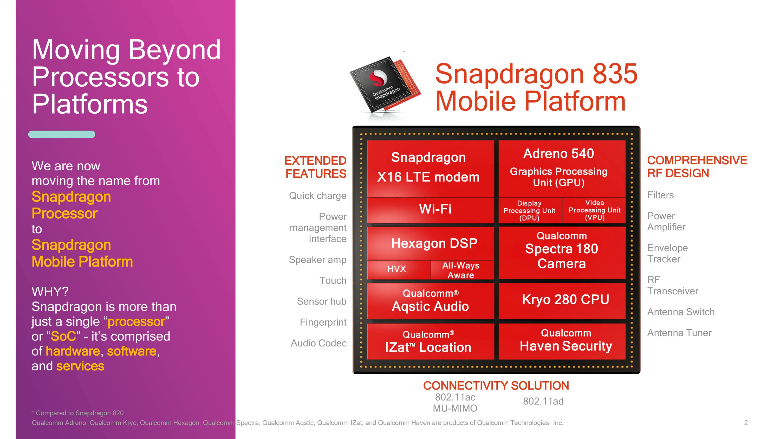 De Snapdragon is bovendien meer dan alleen een processor of een System-on-a-Chip (SoC). Zo bevat de Snapdragon standaard een geïntegreerd LTE x16-modem voor 4G- en 5G-connectiviteit. Voor wifi is er ondersteuning voor de in potentie zeer snelle maar uitermate weinig gebruikte 801.11ad WiGig-techniek, en daarom is de ondersteuning voor 2x2 802.11ac-mu-mimo belangrijker.