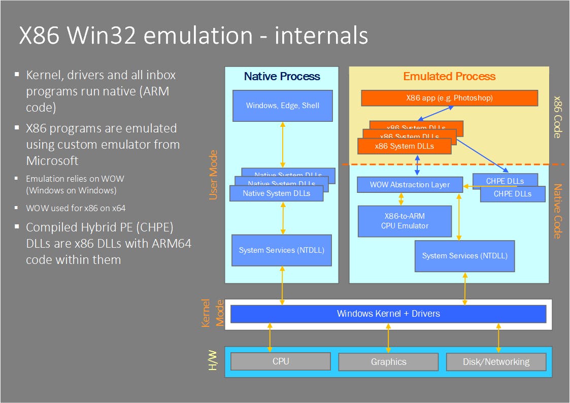 Roept een Win32-programma een systeembibliotheek aan, dan gebeurt dat dus native. Het enige wat geëmuleerd wordt, is de x86-code van de applicatie zelf – de rest is allemaal native ARM64. De enige beperking van de emulator in Windows-op-ARM is dat het uitsluitend 32-bits Windows-applicaties ondersteunt. De reden hiervoor is enerzijds het voor 64bit-code te kleine aantal registers op een ARM-processor (12 waarvan 8 beschikbaar voor opslag van de huidige instructies tegen 16 op een x64-processor), plus het feit dat Microsoft de Windows-on-Windows-emulator hiervoor rigoureus zou moeten herschrijven.
