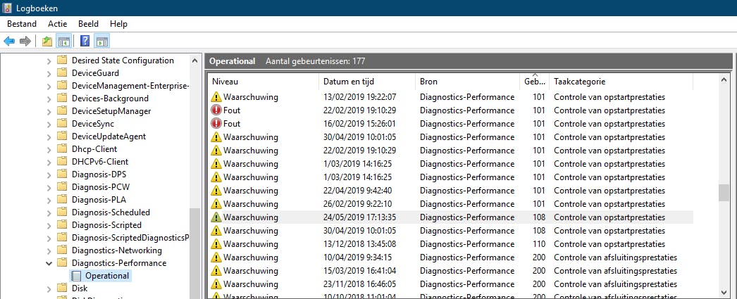 Zoals bij veel andere systeemprocessen houdt Windows gedetailleerde logs bij over het bootproces. Om deze in te zien, voer je het commando eventvwr.msc uit in het Windows startmenu en navigeer je in het linkervenster achtereenvolgens naar Logboeken (lokaal) / Logboeken Toepassingen en Services / Microsoft / Windows / Diagnostics-Performance / Operational. In het middelste venster klik je vervolgens op de kolomtitel Gebeurtenis-id, zodat die oplopend wordt gesorteerd. Iedere keer dat Windows opstart worden er namelijk gebeurtenissen met ID 10x gelogd inclusief de starttijd, de ID’s lopen van 100 tot 110: 101 voor applicaties, 102 voor drivers, 103 voor services enzovoort.
