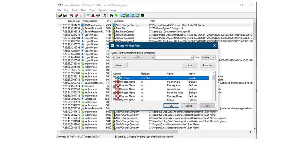 Kies Filter / Filter en stel bijvoorbeeld de volgende filterregel in: Duration more than 1 then Include. Bevestig met OK (dat herleidde het aantal items in onze test van een onwerkbare 4,8 miljoen naar een behapbare 187). Vervolgens kun je de resterende items aan een nader onderzoek onderwerpen. Een wat ouder, maar nog steeds informatief voorbeeld van zo’n analyse vind je hier.