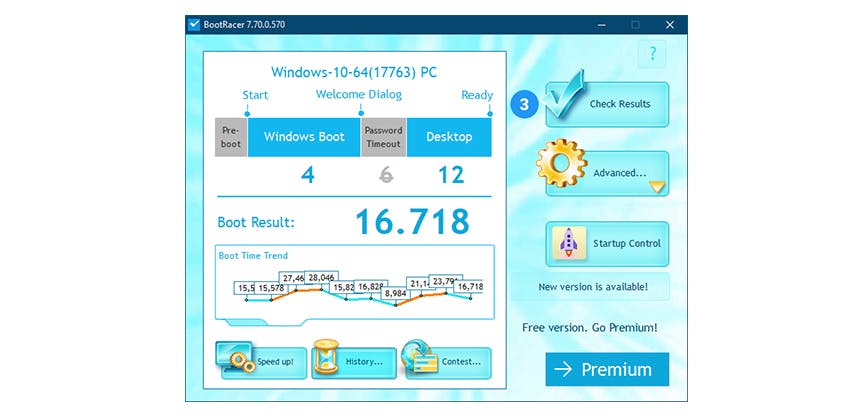 Standaard voert BootRacer deze analyse bij elke Windows-start uit, maar dat schakel je desgewenst uit: klik op Advanced / Options en kies Only once. Kies je wel voor een doorlopende analyse, via de knop History krijg je zicht op de evolutie van de opeenvolgende starttijden van je systeem.