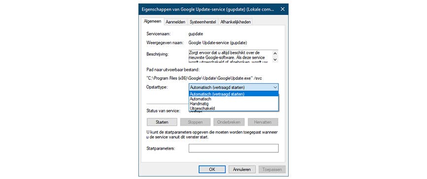 Let op: je kunt hier ook Automatisch (vertraagd starten) kiezen: de service wordt dan pas opgestart nadat het bureaublad is verschenen (standaard twee minuten na het opstarten van de laatste automatische service), waardoor het niet langer een impact heeft op de eigenlijke bootprestaties. Open hier zeker ook het tabblad Afhankelijkheden. Je ziet hier welke andere services van de (goede werking van de) geselecteerde service afhangen, zodat je niet ongewild ook die services uitschakelt.