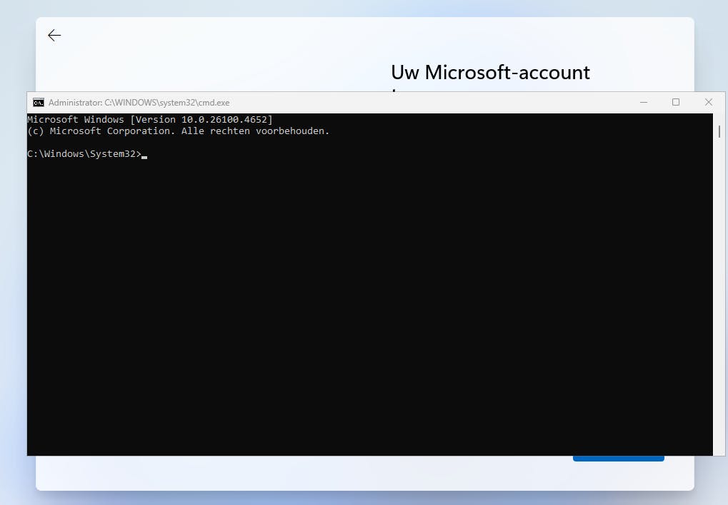 In dit scherm voor je een speciale opdracht in waarmee we de verplichte invoer voor een Microsoft-account gaan omzeilen. Zodra Windows 11 heeft gedetecteerd dat jouw computer een werkende verbinding heeft, blijf je op dat accountscherm hangen, maar ook wanneer er nog geen verbinding is gemaakt, wil Microsoft toch eerst dat je verbinding maakt en daarna alsnog met een Microsoft-account aan de slag gaat.