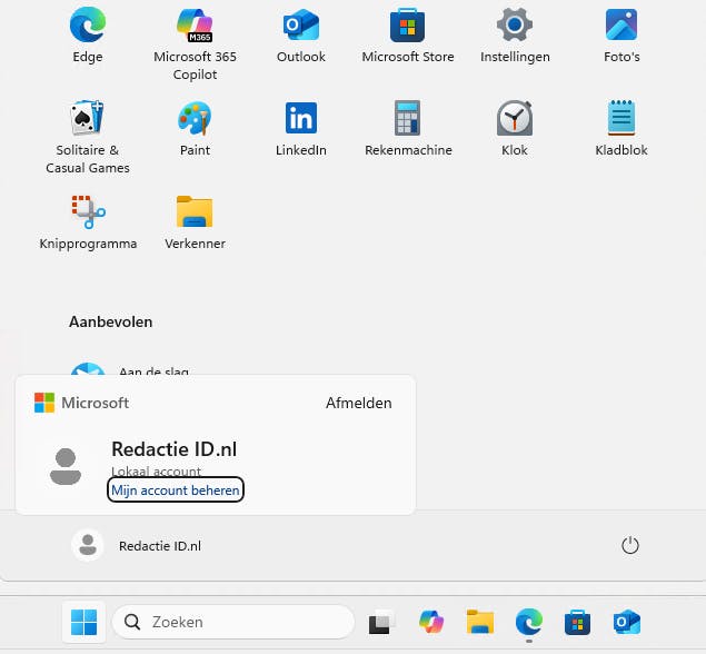 Het account waarmee je je aanmeldt is een administrator-account. In dat geval doe je er goed aan om een wachtwoord in te stellen als je dat nog niet hebt gedaan in de hierboven uitgelegde stap. Om een wachtwoord in te stellen, klik je op de Startknop, en vervolgens op je accountnaam en kies je voor Mijn account beheren.