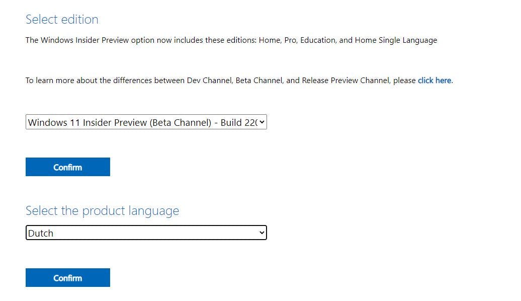 Alleen als je aangemeld bent als Windows Insider, krijg je toegang tot Microsofts webpagina met officiële Windows 11-downloads. Eenmaal ingelogd heb je bij de Windows Insider Preview Downloads de keuze uit twee edities van Windows 11, de Dev-versie en de Beta-versie. De eerste is het meest experimenteel, de tweede is stabieler.