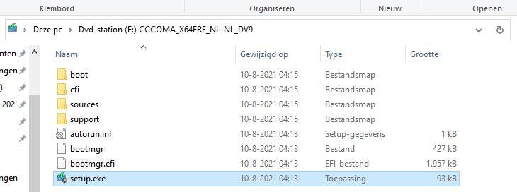 Met deze ISO kun je nu verschillende kanten op. Je zou Windows 11 ermee over je bestaande Windows 10-installatie kunnen installeren, met of zonder bestandsbehoud. Daarvoor dubbelklik je op het ISO-bestand en open je setup.exe, waarna je de installatie-wizard volgt.
