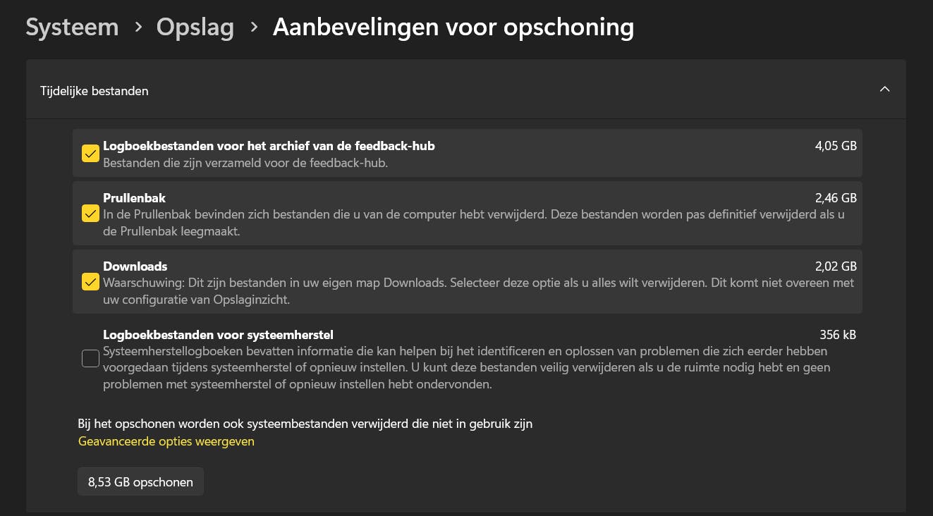 In het onderdeel Opslagbeheer open je Aanbevelingen voor opschoning. Hier staan alvast vier suggesties van groepen in de sectie Tijdelijke bestanden die je mag snoeien. De opties Prullenbak en Downloads zijn de eerste twee locaties die je veilig kunt leegmaken. Vink deze opties aan. Ook de optie Logboekbestanden voor het archief van de feedback-hub kun je aanvinken. Onderaan lees je hoeveel ruimte je wint met deze schoonmaakoperatie. We raden af om ook de optie Logboekbestanden voor systeemherstel te gebruiken. Daar valt trouwens meestal heel weinig winst te halen. Klik vervolgens op Opschonen. Ga ook eens kijken in het onderdeel Grote of ongebruikte bestanden of daar geen oude video’s of andere grote bestanden zijn achtergebleven. Hetzelfde geldt voor Bestanden gesynchroniseerd met de cloud.
