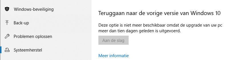De periode van tien dagen is niet zomaar uit de lucht gegrepen, want dit tijdsbestek geldt nu ook al voor het ongedaan maken van reguliere Windows 10-updates. Je vindt deze optie onder Instellingen, Bijwerken en beveiliging, Systeemherstel, Teruggaan naar de vorige versie van Windows 10.