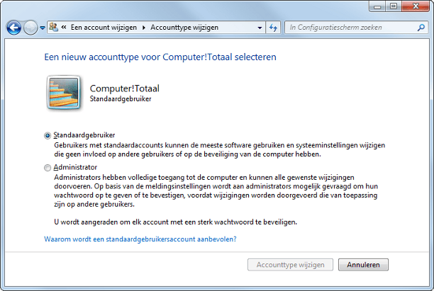 In de vorige stap las u over het kiezen van een accounttype. Windows 7 maakt onderscheid tussen twee soorten accounts: Standaardgebruiker en Administrator. Uit veiligheidsoogpunt doet u er goed aan altijd te kiezen voor de standaardgebruiker. Dit account heeft minder rechten dan een administrator, maar geeft gebruikers voldoende vrijheid bij het aanpassen van instellingen en het gebruiken van software. Maakt u iedereen administrator, dan loopt u een onnodig veiligheidsrisico. Kwaadaardige programma's kunnen administratorrechten misbruiken om schade toe te brengen.