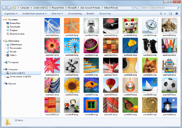 Elk gebruikersaccount heeft een eigen afbeelding. U selecteert deze bij het maken van het account. U kunt een eigen afbeelding kiezen door te klikken op de optie Zoeken naar meer afbeeldingen. Bent u niet tevreden met de standaardafbeeldingen, dan kunt u deze ook vervangen door uw eigen afbeeldingenset. Open de map C:\ProgramData\Microsoft\User Account Pictures\Default Pictures en vul deze map met uw eigen afbeeldingen. Zorg ervoor dat het bmp-afbeeldingen zijn met een afmeting van 128 bij 128 pixels.