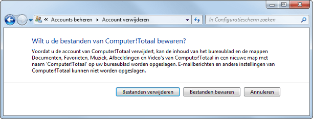 Gebruikersaccounts die u niet meer gebruikt, verwijdert u. In het Configuratiescherm kiest u voor Gebruikersaccounts en Ouderlijk toezicht / Gebruikersaccounts toevoegen of verwijderen. Kies Een ander account beheren, klik op het account dat u wilt verwijderen en kies account verwijderen. U hebt nu de mogelijkheid om een aantal bestanden (waaronder de inhoud van de mappen Documenten, Afbeeldingen, Video's en het bureaublad) in een archiefmap op het bureaublad te plaatsen. Klik dan op Bestanden bewaren of op Bestanden verwijderen als u de bestanden niet meer nodig hebt.