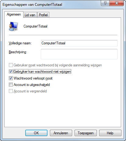 Per gebruiker kunt u bepalen hoe strikt Windows met wachtwoorden is. U maakt hiervoor gebruik van het onderdeel Lokale gebruikers en groepen. Druk op de toetscombinatie Windows-toets+R en typ Lusrmgr.msc. Klik op OK. Links in het venster klikt u op Gebruikers. Dubbelklik hierna op de gebruiker voor wie u de rechten wilt aanpassen. Wilt u niet dat het wachtwoord kan worden veranderd? Plaats een vinkje bij Gebruiker kan wachtwoord niet wijzigen. Bovendien kunt u het account tijdelijk ontoegankelijk maken, kies dan voor Account is uitgeschakeld.