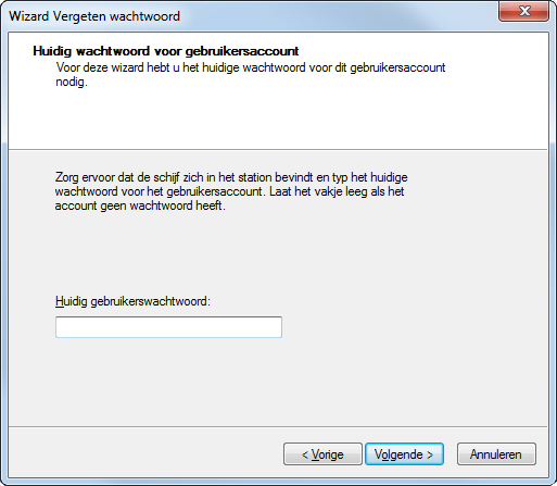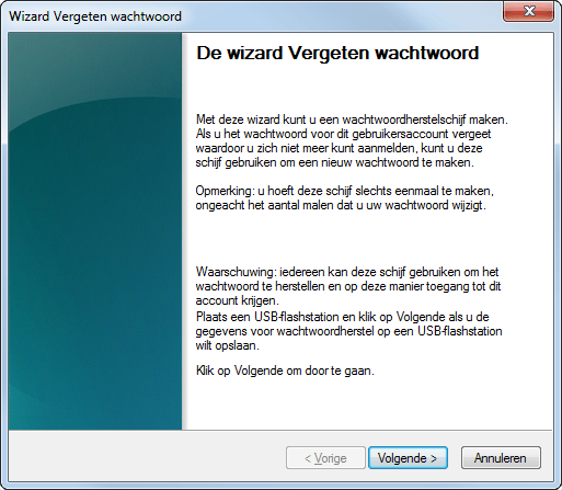 Als u het wachtwoord voor het gebruikersaccount onverhoopt niet meer weet, herstelt u de toegang met de wachtwoordherstelschijf die u in de vorige stap hebt aangemaakt. In het aanmeldingsscherm klikt u op de optie Wachtwoord herstellen. Plaats nu de usb-stick (uw wachtwoordherstelschijf). Een wizard verschijnt. Geef aan op welk station de schijf zich bevindt en volg de stappen van de wizard.