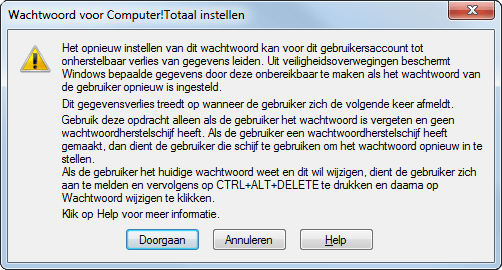 Stel dat u of een medegebruiker het wachtwoord niet meer weet en er ook geen wachtwoordherstelschijf is gemaakt. Er is nog een mogelijkheid om het account toegankelijk te maken. Druk op Windows-toets+R en typ Lusrmgr.msc. Druk op Enter en selecteer het gebruikersaccount dat u niet meer kunt openen. Kies nu voor Actie / Wachtwoord instellen. Windows toont een flinke waarschuwing, waarin u onder meer wordt gewezen op de mogelijkheid dat bepaalde gegevens niet meer toegankelijk zijn na het aanpassen. Klik op Doorgaan en volg de stappen van de wizard.