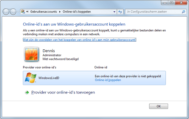 Om bestanden in Windows 7 makkelijk te delen met behulp van uw thuisgroep, is het verstandig om een online-id aan uw Windows-gebruikersaccount te koppelen. In de praktijk koppelt u hierbij een Windows Live ID (bijvoorbeeld een Hotmail-adres) aan de uw lokale gebruikersaccount. Hierdoor kunnen anderen mappen en bestanden met u delen via uw online-id en hoeft er geen gebruikersaccount meer te worden gemaakt op elke computer.