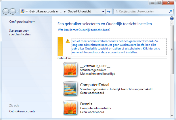Zorg ervoor dat alle gebruikersaccounts voorzien zijn van een wachtwoord. Dat is niet alleen een vereiste voor een veilige computer, maar ook van praktisch belang. Sommige services, zoals het besproken Ouderlijk toezicht (stap 18), vereisen zelfs dat alle accounts gebruikmaken van een wachtwoord.