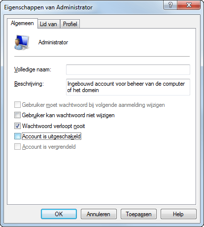 Standaard werkt u in Windows 7 nooit met het échte Administrator-account. Er wordt weliswaar een administrator-account aangemaakt tijdens de installatie, maar deze is beperkt. U kunt het administrator-account alsnog bereiken. In het menu Start klikt u met rechts op Computer. Kies Beheren. Ga naar Lokale gebruikers en groepen / Gebruikers. Dubbelklik op Administrator en haal het vinkje weg bij Account is uitgeschakeld en klik op OK. Voer hierna degelijk wachtwoord in. Kies Actie / Wachtwoord instellen. De gebruiker is voortaan beschikbaar via het welkomstvenster.