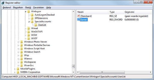 In het welkomstscherm worden alle gebruikersaccounts getoond. Soms wilt u accounts (die u tijdelijk niet gebruikt) in dit venster verbergen. Dit kan helaas alleen via het register. Open Start en typ Regedit.exe, druk op Enter. Zoek naar HKEY_LOCAL_MACHINE\Software\Microsoft\Windows NT\CurrentVersion\Winlogon. Kies voor Nieuw / Sleutel en noem deze SpecialAccounts. Selecteer de sleutel en kies weer Nieuw / Sleutel, noem deze UserList. Kies Nieuw / DWORD-waarde. Geef deze exact dezelfde naam als het gebruikersaccount die u wilt verbergen.