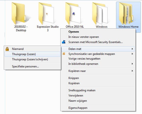 U kunt mappen gemakkelijk delen via thuisgroepen. Klik met de rechtermuisknop op de te delen map en kies Delen met. Als u iedereen met de map wilt laten werken, kiest u voor Thuisgroep (Lezen/schrijven). Geeft u liever alleen leesrechten dan kiest u Thuisgroep (Lezen). U kunt de mappen ook met specifieke personen delen, kies voor Specifieke personen. Typ vervolgens de naam van de gebruiker waarvoor u de machtiging wilt bepalen. Klik op Toevoegen en bepaal via Machtigingsniveau welke rechten de gebruiker krijgt.