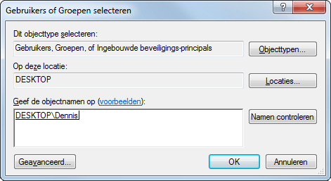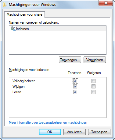 U hoeft geen genoegen te nemen met de standaard deelinstelling van Windows. Klik met de rechtermuisknop op de map die u wilt delen en kies Eigenschappen. Op het tabblad Delen klikt u op Geavanceerd delen. Plaats een vinkje bij Deze map delen. Bij Sharenaam geeft u een geschikte naam op. Klik vervolgens op Machtigingen. Klik op de knop Toevoegen. Vervolgens geeft u de naam van de gebruiker op. Klik hierna op Namen controleren. Het bijbehorende gebruikersaccount wordt door Windows opgezocht. Voeg alle gebruikers op dezelfde manier toe. Klik op OK.