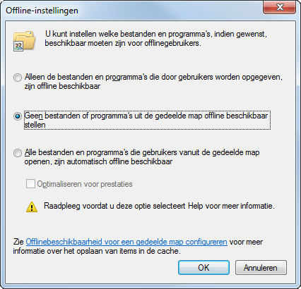 Gedeelde netwerkmappen kunnen offline beschikbaar worden gemaakt, bijvoorbeeld als gebruikers tijdelijk niet met het netwerk zijn verbonden. U kunt zelf bepalen voor welke mappen dit geldt. Klik met de rechtermuisknop op de map, kies Eigenschappen / Delen / Geavanceerd delen. Klik op Cache. Wilt u niet dat de mapinhoud offline beschikbaar wordt? Kies dan Geen bestanden of programma's uit de gedeelde map offline beschikbaar stellen. Daarnaast kunt u de mapinhoud juist wel beschikbaar stellen (via de eerste optie) of automatisch beschikbaar maken (via optie drie).