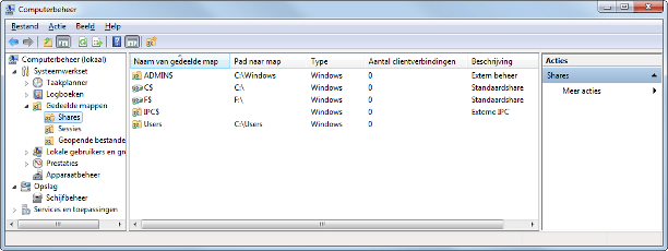 Helaas geeft Windows 7 geen duidelijk totaaloverzicht van gedeelde mappen. Met een omweg kunt u dit wel opvragen. Druk op de toetscombinatie Windows-toets+R. Het venster Uitvoeren verschijnt. Typ compmgmt.msc en klik op OK. In het venster Computerbeheer kiest u in het linkeroverzicht voor Gedeelde mappen / Shares. Een overzicht van gedeelde mappen verschijnt. Dubbelklik op een map om de details te bekijken. Hier ziet u onder meer welke gebruikers toegang tot de mappen hebben, welke rechten zij hebben en waar de map is opgeslagen.