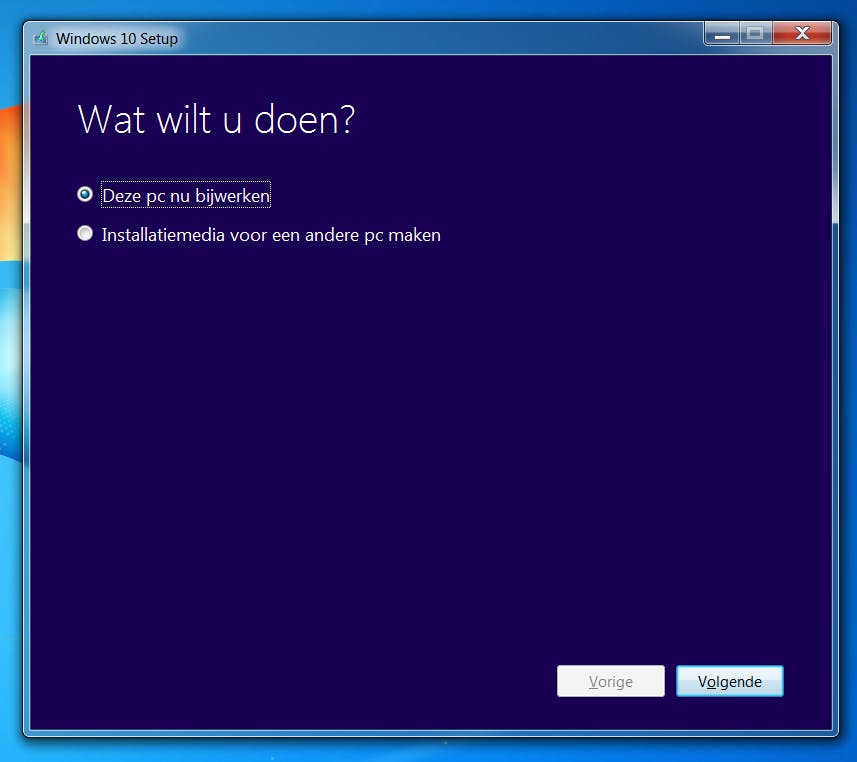 Tip: De tool laat je ook direct een clean install doen. Wanneer je daarvoor kiest, houd er dan rekening mee dat je het systeem niet terug kan draaien naar Windows 7 of 8/8/.1. Kies hier dus alleen voor als je zeker weet dat Windows 10 je bevalt.