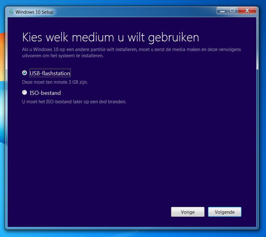 Wil je een installatiestick maken, zorg er dan voor dat je een lege usb-stick met minstens 3 GB ruimte hebt aangesloten. De eerste optie schrijft een bootable Windows 10-installatie naar de stick. Kies je voor ISO-bestand, dan maakt de tool een Windows 10 ISO. Die kun je daarna op een dvd branden, of zelf op een bootable disc zetten met een programma als Rufus.
