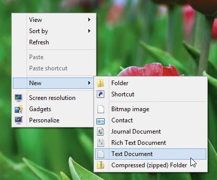 We beginnen dus met wat eigen inventiviteit, die u geen cent kost. Start Windows 8 en klik na inloggen op de tegel Desktop. We gaan nu een nieuw tekstdocument maken met het Kladblok. Klik met de rechtermuisknop op en leeg stuk bureaublad. In het daarop geopende contextmenu klikt u onder Nieuw op Tekstdocument. De door ons gebruikte versie van Windows 8 was echter Engelstalig, dus dan wordt het New en Text Document.