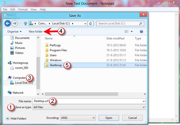 Controleer deze rij commando’s nauwkeurig op fouten en als u er zeker van bent dat alles in orde is, klikt u in het menu Bestand op Opslaan als (File, Save As). Kies in het veld achter Opslaan als voor Alle bestanden (*.*), ofwel Save as type en dan All Files (1). Als Bestandsnaam (File Name) voert u in het daarvoor bestemde veld de naam Desktop.scf (2) in. Om het bestand later makkelijk terug te kunnen vinden is het aanbevelenswaardig een mapje op de C-schijf aan te maken. Klik daarvoor op Computer (3) en dubbelklik dan op de C-schijf in het paneel rechts. Klik vervolgens op de knop Nieuwe map (New folder) (4) en geef de map – bijvoorbeeld – de naam Startknop. Dubbelklik op de nieuw aangemaakte map (5) en daarna op de knop Opslaan (Save). Sluit het venster Kladblok, eventueel kan nu ook de bureaubladsnelkoppeling Nieuw tekstdocument verwijderd worden.