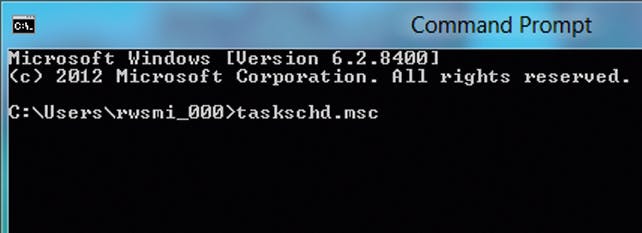 Schuif naar rechts – dat kan met de balk onderin beeld – en klik op Opdrachtprompt (Command Prompt). In het daarop geopende venster tikt u taskschd.msc gevolgd door een druk op de Enter-toets.
