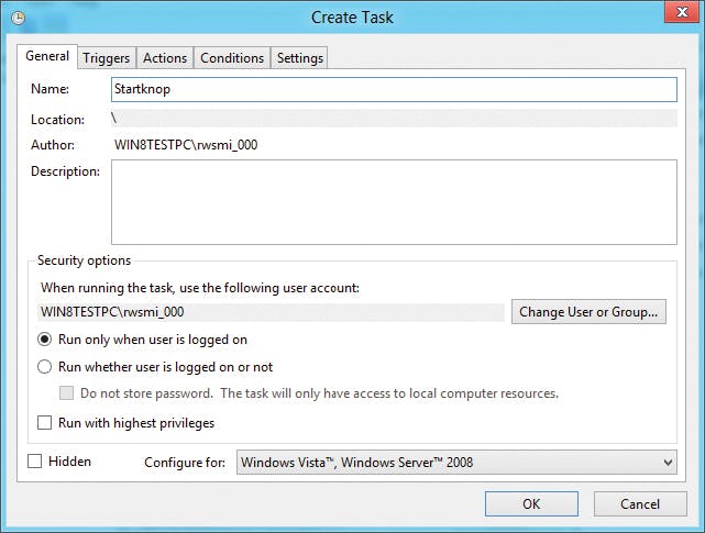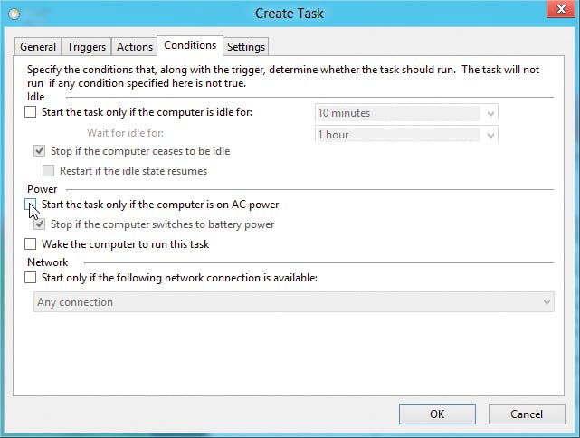 Klik op OK in het venster Nieuwe Actie waarna de taak in de vorm van het eerder getypte script is toegevoegd. Om deze taak áltijd onder alle omstandigheden uit te laten voeren schakelt u op het tabblad Voorwaarden (Conditions) de optie De taak alleen starten als de computer op netstroom werkt (Start the task only if the computer is on AC power) uit. Hiermee voorkomt u dat bij stopcontactloos gebruik van uw net- of notebook de Startknop ineens verdwijnt. Klik tot slot op OK en de taak is toegevoegd. Het venster Taakplanner (Task Scheduler) en Opdrachtprompt (Command Prompt) mag u nu sluiten.