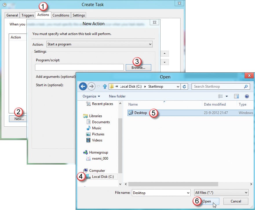 Klik in het menu Actie van de inmiddels geopende Taakplanner op Taak maken. In het nieuw verschenen venster vult u op het tabblad Algemeen (General) de naam van de taak in, bijvoorbeeld Startknop. Klik nu op het tabblad Acties (Actions) (1) op de knop Nieuw (New) (2) en daarna in wederom een nieuw venster op de knop Bladeren (Browse) (3). In nóg een nieuw venster klikt u op de C-schijf onder Computer (4) om vervolgens te dubbelklikken op de map waarin u het eerder gemaakte bestand Desktop.scf hebt bewaard. Selecteer dit bestand (5) en klik op Openen (6).