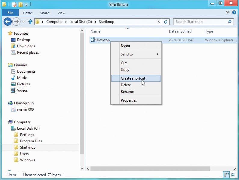 Het gemaakte script moet ook nog in de map Opstarten geplaatst worden. Omdat Microsoft deze map echter verborgen heeft, wordt ook dit even wat meer werk dan u gewend bent. Sterker nog: het wordt even heel goed opletten nu, want u moet heel precies naar een map navigeren die afhankelijk is van uw Windows gebruikersnaam. Keer allereerst terug naar de tegelinterface, klik daar op een leeg stukje met de rechtermuisknop en scroll weer naar rechts. Klik dan op Windows Verkenner (Windows Explorer) en blader naar de map met het bestand Desktop.scf. Klik er met de rechtermuisknop op en kies in het daarop geopende contextmenu voor de optie Maak snelkoppeling (Create shortcut). Klik dan met de rechtermuisknop op het bestand Desktop – Shortcut (Desktop – Snelkoppeling) en klik met de linkermuisknop in het geopende contextmenu op Kopiëren (Copy).