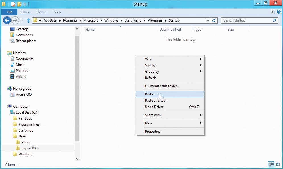 Nu wordt het even héél goed opletten, want we moeten in de Verkenner bladeren naar de map C:\Users\<UW GEBRUIKERSNAAM>\AppData\Roaming\Microsoft\Windows\Start Menu\Programs\Startup. Deze map zal hoogstwaarschijnlijk verborgen zijn, dus het wordt tikwerk. Eerst moet echter uw gebruiksnaam achterhaald worden, ga daarvoor naar de map Users op de C-schijf. U vindt daar tenminste twee mappen: Users en – in ons voorbeeld – een map met de naam rwsmi_000. Dát is de gebruikersnaam die Windows intern gebruikt en die u invult op de plek van <UW GEBRUIKERSNAAM> in bovengenoemde locatie. Klik in de adresbalk van de Verkenner en vul de complete locatie in, dat zou in ons geval dus worden: C:\Users\rwsmi_000\AppData\Roaming\Microsoft\Windows\Start Menu\Programs\Startup. Druk op Enter en als het goed is opent nu eindelijk de map Opstarten. Let heel goed op spaties, hoofd- en kleine letters en underscores (_). Eenmaal in de map aanbeland klikt u in het nog lege rechter paneel met de rechtermuisknop. In het contextmenu dat u dan ziet klikt u op Plakken (Paste), waarna de eerder gekopieerde snelkoppeling in de map Opstarten wordt geplaatst.