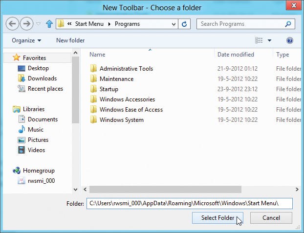 De Startknop is niet zonder noeste programmeerarbeid en gedegen kennis van zaken toe te voegen. Maar met de wetenschap dat de mappenstructuur die achter het aloude menu Start verstopt zit volledig in tact is gehouden, kunnen we een eigen startknop maken door op de werkbalk Snel Starten een snelkoppeling naar deze map te maken. Daarvoor maakt u eerst een nieuwe werkbalk aan, klik met de rechtermuisknop op een leeg stukje werkbalk en selecteer in het geopende contextmenu onder Werkbalken de de optie Nieuwe werkbalk (Toolbars, New Toolbar). Als maplocatie tikt u in het nieuwe venster C:\Users\<UW GEBRUIKERSNAAM>\AppData\Roaming\Microsoft\Windows\Start Menu\, waarbij <UW GEBRUIKERSNAAM> weer vervangen dient te worden door de eerder gevonden gebruikersnaam. Klik dan op de knop Map selecteren (Select Folder).
