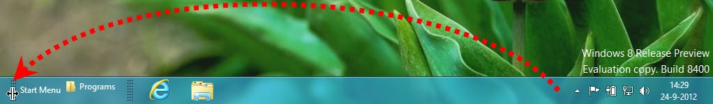 We hebben nu een werkend surrogaat-startmenu, maar het bevindt zich in tegenstelling tot wat u gewend bent helemaal aan de rechterkant van de taakbalk. Om dat euvel te verhelpen klikt u met de rechtermuisknop op een leeg stukje taakbalk en daarna in het bijbehorende contextmenu op Taakbalk vergrendelen (Lock the taskbar). In deze onvergrendelde modus zijn werkbalken te verslepen. Dat is een beetje priegelen, want u moet met de muisknop op het inmiddels verschenen verticale verdeelbalkje van de werkbalk Start klikken. Houd dan de muisknop ingedrukt en sleep helemaal naar links van de taakbalk, u ziet dat er stuivertje gewisseld wordt met de standaard aanwezige taakbalk met daarin Internet Explorer en Windows Verkenner. Laat dan de muisknop weer los.