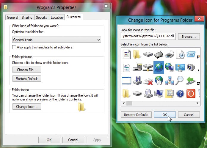 Nu nog even een beetje finetunen, klik allereerst met de rechtermuisknop op Startmenu en in het daarna op Eigenschappen (Properties). In het venster dat u daarna ziet klikt u op het tabblad Aanpassen (Customize). Klik op Ander pictogram (change Icon) en kies een pictogram naar smaak. Klik op OK en nogmaals op OK in het eigenschappenvenster.