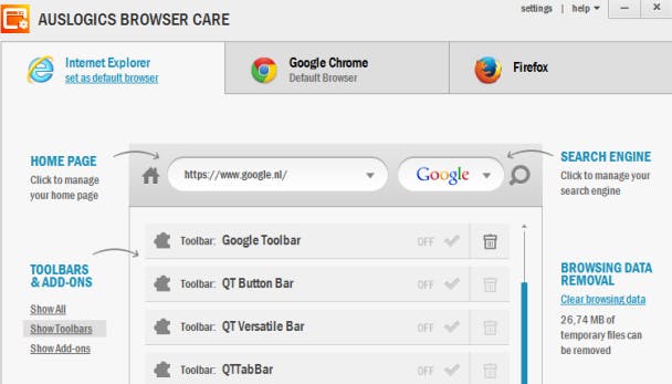 Auslogics Browser Care maakt het beheren van je browserinstellingen eenvoudiger. Het programma ondersteunt Internet Explorer, Firefox en Chrome. Je kunt vanuit het programma onder meer de standaard zoekmachine aanpassen (of herstellen), de startpagina wijzigen en cache leegmaken. Ook het inschakelen, uitschakelen en (soms) verwijderen van invoegtoepassingen en uitbreidingen behoort tot de mogelijkheden. Kom je er niet meer uit? Herstel de browser met Restore browser settings naar de standaardinstellingen.
