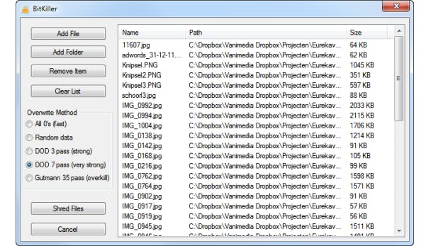 Om een bestand echt te vernietigen, heb je een programma nodig als BitKiller. BitKiller overschrijft de schijfruimte meerdere keren, waardoor je bestanden echt weg zijn. Start BitKiller en sleep de bestanden die je wil vernietigen naar het BitKiller-venster. Kies een shredder-instelling, bijvoorbeeld DOD 3 pass om bestanden drie keer te overschrijven. Bevestig met Shred files om je bestanden te vernietigen. Let op: gebruik BitKiller met aandacht. Als een bestand eenmaal onder handen is genomen, is er geen weg terug!
