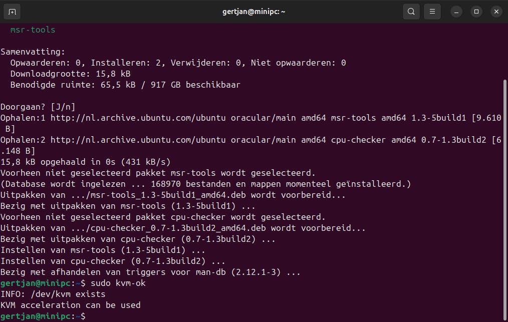 Het systeem waarop je de speciale Docker-containers gaat gebruiken moet KVM en hardware-virtualisatie ondersteunen, zoals Intel VT-x of AMD-V. Dat komt omdat binnen de Docker-container een virtuele machine met Windows wordt opgebouwd, die gebruikmaakt van Qemu én van hardware-virtualisatie via KVM. Dat zal in de regel geen probleem zijn, maar soms moet je deze virtualisatie-opties nog aanzetten in het BIOS. Hoe je dat precies doet verschilt per BIOS. Je kunt voordat je aan de slag gaat relatief eenvoudig controleren of je systeem geschikt is door de onderstaande opdrachten te geven. De tool meldt of KVM beschikbaar is en of jouw systeem kan worden gebruikt voor hardwareversnelling.