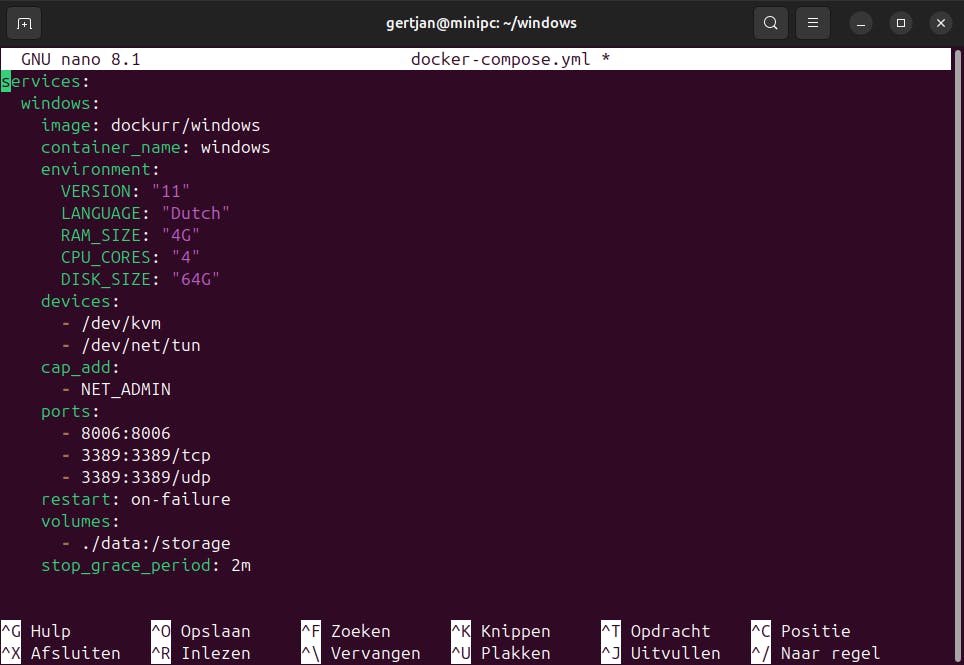 We beginnen met de installatie van Windows. Hoewel je de container via de opdrachtregel kunt starten, is het veel praktischer om een configuratiebestand voor Docker Compose te maken. Ook gelet op eventuele aanpassingen in de toekomst. Open hiervoor een terminalvenster, ga naar je thuismap (cd ~), maak een nieuwe map (mkdir windows) en blader naar die map (cd windows). Maak in deze map vervolgens het configuratiebestand met nano docker-compose.yml en geef het de onderstaande inhoud. Hierbij hebben we de standaardconfiguratie van de projectpagina als startpunt genomen, maar wel enkele opties gewijzigd of toegevoegd. De belangrijkste aanpassingen zullen we straks behandelen.