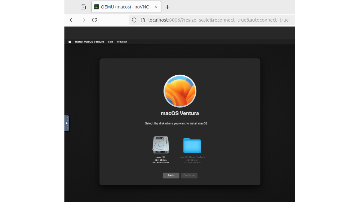 Verwijs een browser naar poort 8006, op het lokale systeem is dat ook hier http://localhost:8006. Nu zal macOS op de achtergrond worden gedownload. Vervolgens verschijnt een menu. Kies Disk Utility en klik op Continue. Nu moet je de grootste schijf uit de getoonde lijst selecteren met de naam Apple Inc. VirtIO Block Media. Deze is standaard ongeveer 68 GB. Klik op Erase. Vul een herkenbare naam in en klik op Erase om de schijf daadwerkelijk te formateren met het APFS-bestandsformaat (Apple File System). Dit is binnen enkele ogenblikken voltooid. Klik op Done. Sluit het venster via het rode kruisje. Kies Reinstall macOS Ventura, klik op Continue en doorloop het installatieproces. Hierbij moet je akkoord gaan met de gebruiksvoorwaarden en de zojuist geformatteerde schijf selecteren.