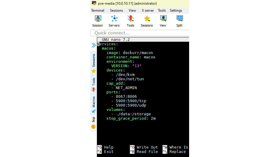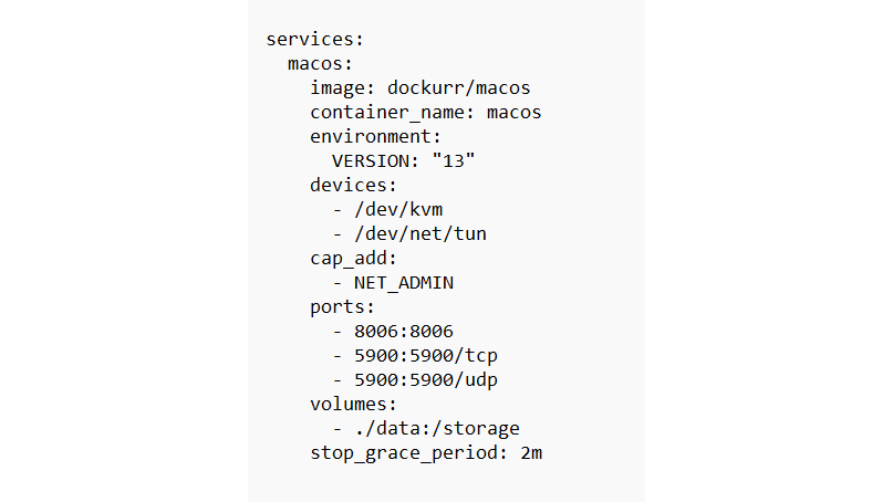 Heb je het gemak ervaren van het werken met Windows binnen Docker, dan is het goed om te weten dat je vrijwel dezelfde procedure kunt volgen voor een installatie van macOS! We gebruiken de onderstaande configuratie. Merk op dat standaard macOS 13 wordt geïnstalleerd, bekend onder de naam macOS Ventura. Deze versie werd uitgebracht in 2022 en zou in deze situatie de beste prestaties geven. Je kunt ook macOS 14 of 15 proberen door het versienummer aan te passen. Voor details kun je de projectpagina op GitHub raadplegen.