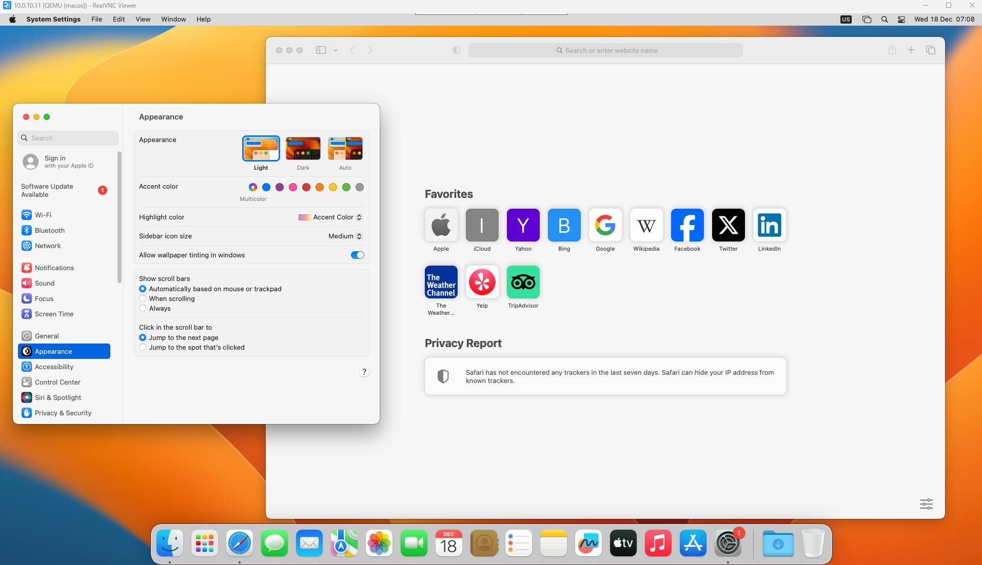 Als laatste maak je een account om binnen macOS mee te werken. Hierna verschijnt de desktop van macOS en kun je daadwerkelijk aan de slag. Het werkt in een browser relatief traag. Gebruik daarom een programma als RealVNC Viewer voor betere prestaties en een hogere resolutie. Om te verbinden hoef je alleen het ip-adres van het systeem in te voeren of je gebruikt localhost.