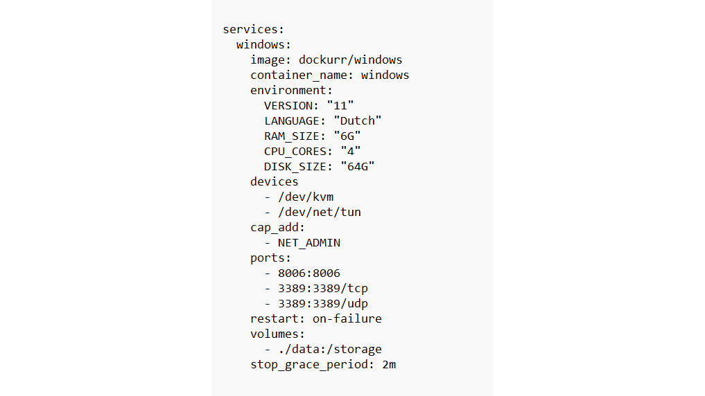 Onder volumes koppelen we een fysieke map (in dit geval ./data) aan /storage in de container waar alle bestanden voor Windows worden bewaard. De host-map wordt automatisch gemaakt als deze nog niet bestaat. Dit volume is belangrijk, omdat Windows anders bij elke herstart van de container opnieuw zal worden geïnstalleerd.