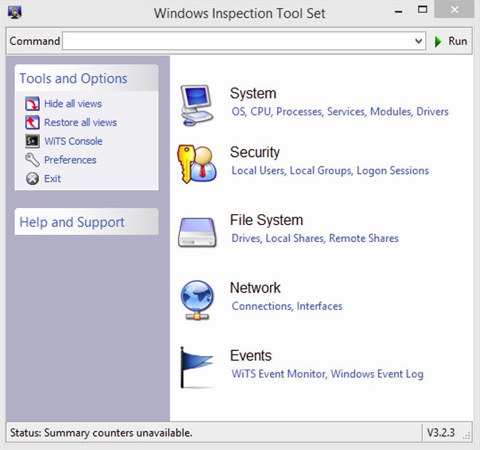 WiTS bestaat zowel in een 32bits- als in een 64bits-versie, maar in beide gevallen heb je de installatie met een paar muisklikken voor elkaar. Bij het opstarten van het programma staat een bescheiden venster voor je klaar, met vijf rubrieken (systeem, beveiliging, bestandssysteem, netwerk en gebeurtenissen) en bijhorende onderdelen. De informatie bij elk geselecteerd onderdeel wordt in een afzonderlijk venster getoond. Dat vinden we wel handig, aangezien je op die manier verschillende vensters (en dus uiteenlopende informatie) tegelijk geopend kunt houden.