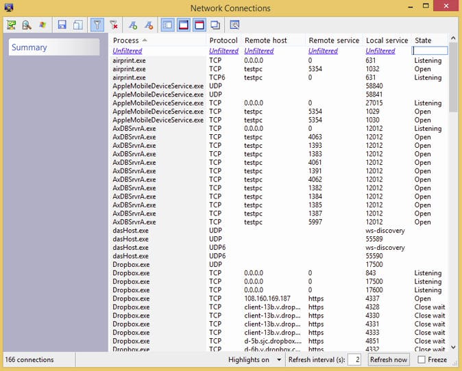 Hoe uiteenlopend de informatie in deze vensters ook kan zijn, nagenoeg elk venster is op dezelfde manier opgebouwd. De relevante informatie is telkens uitgesplitst in een aantal kolommen. Via een knopje bepaal je zelf welke kolommen je wel of niet wenst te zien. De informatie laat zich ook snel sorteren door de gewenste kolomtitel aan te klikken. Minder evident, maar wel zo nuttig, vinden we de filtermogelijkheid die elke kolom je biedt. Activeer je zo'n filter, dan kun je met behulp van operatoren als =, >=, <, ~ (inclusief ondersteuning van RegEx) snel bepaalde waarden uitfilteren.