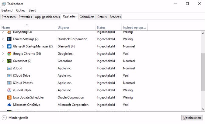 De standaard opstartbeheerder van Windows bereik je op een andere manier dan in Windows 7 en 8.1. Rechtsklik op de taakbalk en kies Taakbeheer. Bij het tabblad Opstarten kun je onderdelen in of uitschakelen (soms is een extra muisklik nodig).