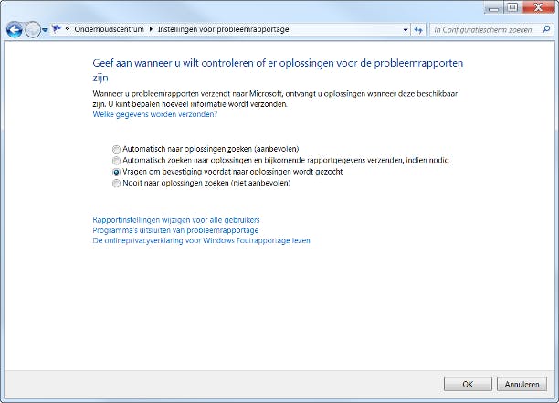 Na een programmacrash gaat Windows automatisch online kijken of er een oplossing voor het probleem is. Op zich mooi, maar het kan vervelend worden als een programma dat u regelmatig gebruikt steeds onderuitgaat en er geen oplossing gevonden wordt. Het online zoeken duurt nogal lang, dus al die tijd zit u lijdzaam af te wachten tot u eindelijk weer verder kunt werken. Beter is het als u dit online zoeken kunt overslaan. Na enkele dagen of weken kunt u dan eventueel zelf een nieuwe poging doen. De kans is uiteraard altijd aanwezig dat er dan wel een oplossing beschikbaar is. Het gedrag dat Windows vertoont zodra een programma in de problemen komt, stelt u in via het onderdeel Probleemrapportage van het configuratiescherm. U klikt op Start / Configuratiescherm / Systeem en beveiliging / Onderhoudscentrum. Daarna klikt u in de linkerkolom op Instellingen voor Onderhoudscentrum wijzigen en tot slot onderin het scherm op Instellingen voor probleemrapportage.